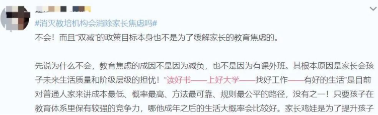 如今失去了“鸡娃”的渠道,孩子一下子变轻松了,可压在父母肩上的担子却变得更重。就像网友说的,本来“
