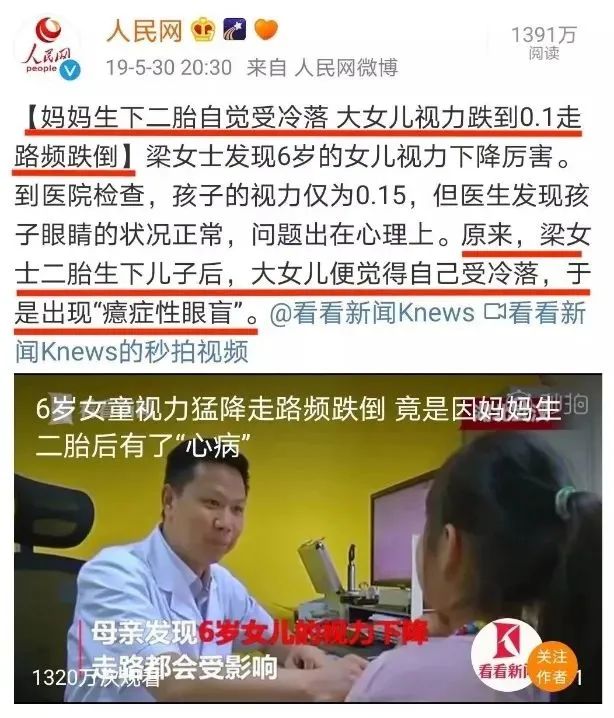 经过医生的询问,原来女儿觉得妈妈有了弟弟之后,就不关心自己了,她觉得妈妈不再爱她了。这导致她患上了“癔症性眼盲”。也就是说,这是一种由心理因素引起的病症。