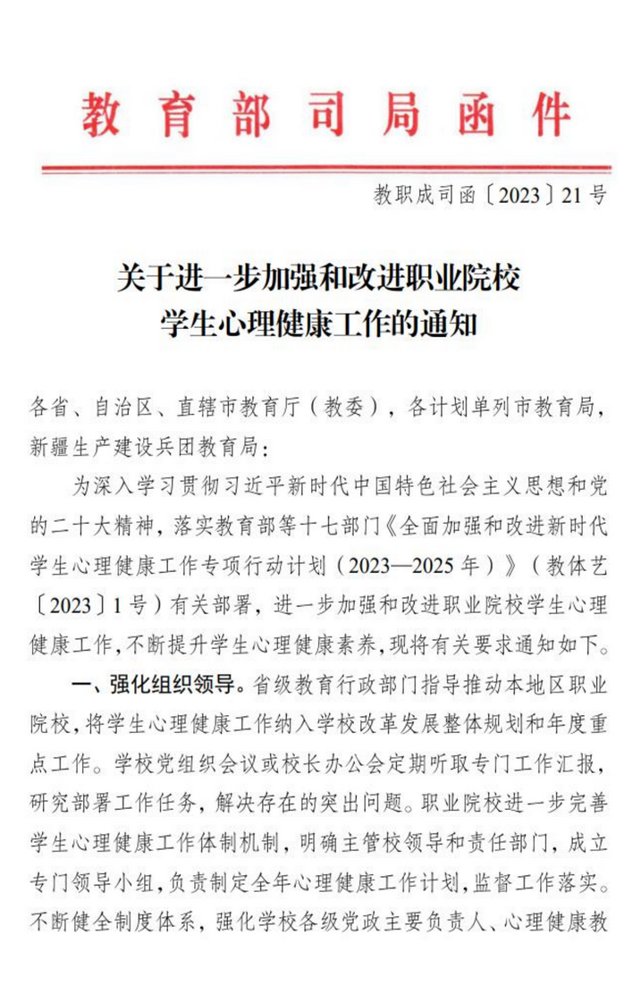 为落实教育部等十七部门《全面加强和改进新时代学生心理健康工作专项行动计划,不断提升学生心理健康素养,教育部通知加强和改进
