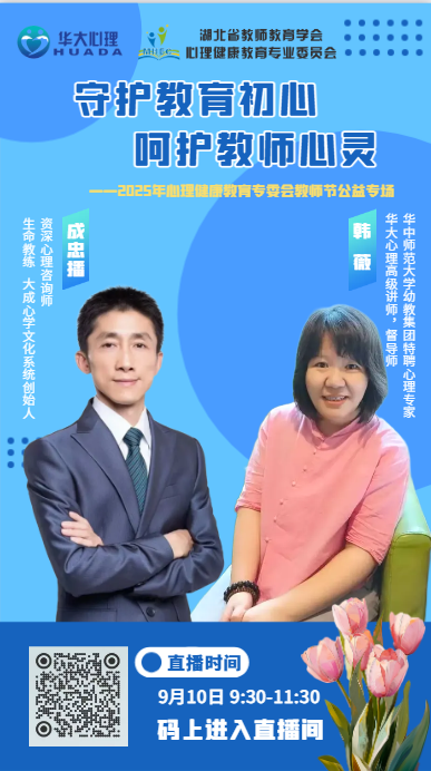 为庆祝第41个教师节,弘扬尊师重教的优良传统,2025年9月10日上午,湖北省教师教育学会心理健康教育专业委员会(以下简称“心理健康教育专委会”)成功举办了“守护教育初心,呵护教师心灵”教师节公益专场直播活动。此次活动由专委会秘书处组织策划,特邀心理健康教育专委会理事成忠播老师和副秘书长韩薇老师作为主讲嘉宾,聚焦教师心理健康需求,为全省教师群体送上一份温暖而专业的节日礼物。