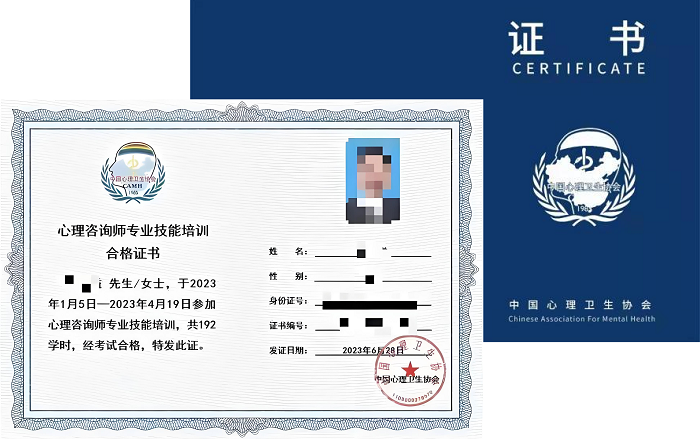 培训结束参加中国心理卫生协会组织的全国统一考试,经考试合格,由中国心理卫生协会颁发《心理咨询师专业技能培训合格证书》。证书统一编号,由中国心理卫生协会网站提供查询。此证书表示持证人已经通过相关课程的培训考核,具备相应的专业知识和职业能力,可作为能力评价、考核、聘用和任职的参考。