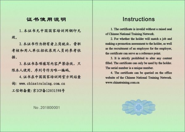 参加培训并考核合格者,颁发中国国家培训网《专业技能培训证书》。根据《职业教育法》规定,该证书可以作为学员的从业凭证;该证书带有防伪标识,其序列号为唯一号码,全国通用,是求职、任职、单位录用的重要依据之一,证书有效性可通过中国国家培训网http://www.chinatraining.com.cn查询。