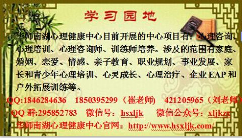 地点:华师南湖心理健康中心三楼301室(雄楚大道桂元路站华师体育学院/华师南湖校区进校区200米即到)